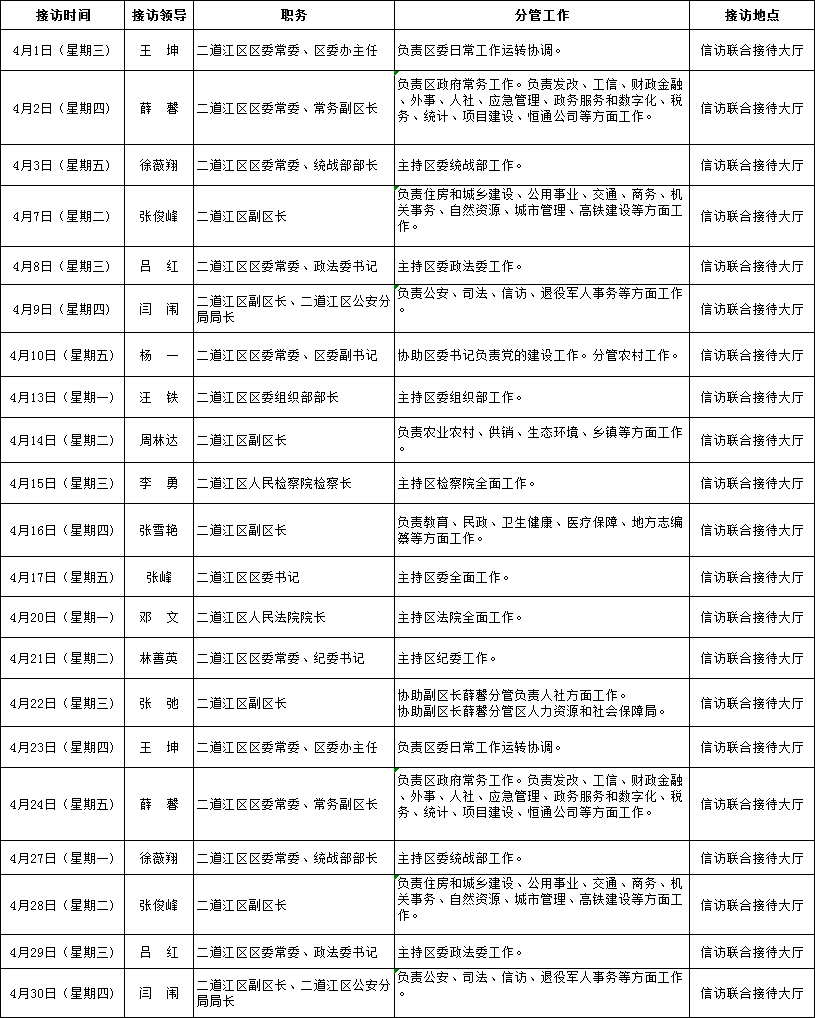 通化市二道江区区级领导干部接访下访安排表